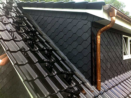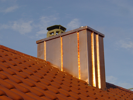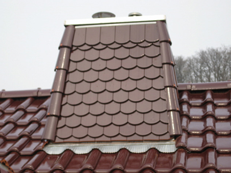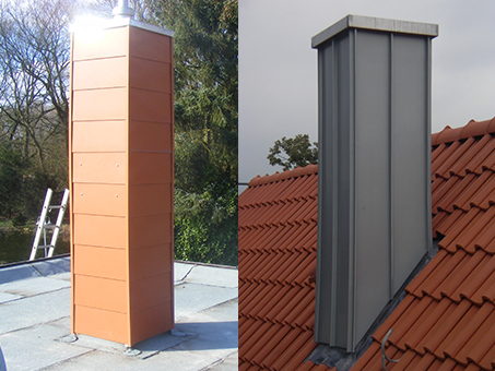 Wir bieten Fassadenverkleidungen und Kaminkopfverkleidung aus Metall (Zink, Kupfer oder Alu), Schieferschindeln, Tonziegel, Holzschindeln oder Holz an.